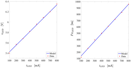 The datasheet of the LED MP-5050-240E [19] provides data for the first three relations. The voltage vs. current relation is modeled using the expression given in (35), where increments in the LED current (mA) also produce increments in the LED voltage (V). The luminous flux vs. current relation is modeled using expression (36), where increments in the LED current (mA) also increase the luminous flux (lm) produced by the LED. Figure 5 shows the data extracted from the manufacturer’s datasheet and the modeling expressions reported in (35) and (36), where a satisfactory agreement is achieved.