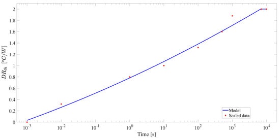 The temperature variation vs. operation time relation is not reported in the manufacturer’s datasheet. However, the work published in [20] reports experimental measurements of changes in thermal resistance during the stabilization time of the LED, for three different commercial LEDs. That work shows the same dynamic behavior for the three LEDs, and the main difference corresponds to the steady-state (final) value, which is equal to the thermal resistance reported in the manufacturer’s datasheet. Those experimental data were normalized with the value of each LED to produce a relative thermal resistance behavior (%), which is modeled by expression (39). This expression is a polynomial calculation based on the logarithm of the operation time, and the maximum value of is . Finally, the dynamic behavior of the thermal resistance in the LED MP-5050-240E is obtained by multiplying by the static thermal resistance °C/W reported in [19], as given in (40). Figure 7 shows the scaled data and dynamic model behavior of the thermal resistance MP-5050-240E, where the expression (40) provides a satisfactory performance. It is observed that the thermal stabilization of the LED occurs around 70,000 s, i.e., 1 h and 57 min. In addition, the change in the temperature of the LED is calculated by multiplying the dynamic thermal resistance and the power of the LED.