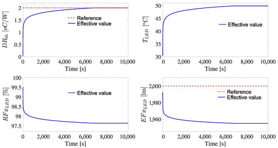 Finally, the simulations reported in this subsection confirm the correct regulation of the luminous flux provided by the proposed solution. This is evident from the system performance without the temperature compensator (Figure 8) and with the temperature compensation activated (Figure 15), where the designed temperature compensator successfully regulates the luminous flux for a wide range of temperature conditions. Moreover, the luminous flux can be increased or decreased by changing the reference of the controller, thus providing higher flexibility to the LED system.