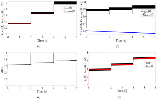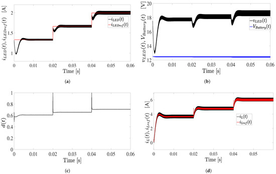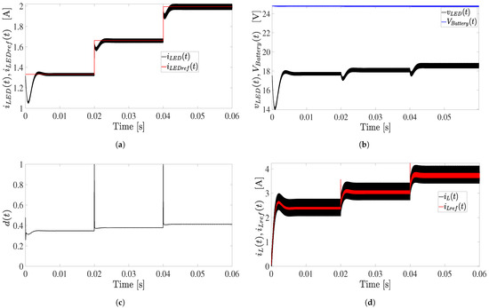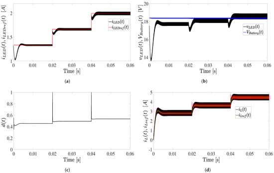 Figure 11a shows that the behavior is similar to that of the 12 V battery. This is because the references of the iLedref currents are the same. Figure 11b reports that the converter operates as a reducer up to 20 ms. Between 20 ms and 40 ms it operates with a voltage conversion factor close to the unit, and from 40 ms to 60 ms it operates in boost mode. The battery voltage is maintained at 18.4 V, which corresponds to a full charge operation. Figure 11c shows that the duty cycle is not saturated and has a lower value than that of the 12 V battery. It will also have fixed-frequency switching. In Figure 11d, the inductor current follows the reference current satisfactorily. The system remains fixed-frequency switching and the error in the controlled current is minimal.