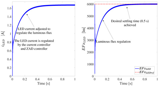 Taking into account that the combined operation of the LED current controller and the ZAD controller imposes the desired current to the LED groups, such a closed-loop system behaves as a current source ensuring . Then, the temperature compensator of Figure 9 adjust the reference of the LED current controller to ensure the desired luminous flux for any operation temperature. Figure 14 shows the performance of the system under the start-up condition (up to 1 s), where the current of the LED group is adjusted to produce the desired luminous flux lm. Moreover, the figure also confirms that the controller imposes the desired settling time (0.5 s).