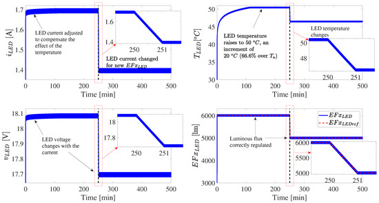 A longer simulation is performed to test the system behavior during the thermal stabilization of the LED groups. Figure 15 shows the simulation of the system with an initial reference of the luminous flux equal to lm, where the temperature of the LED group has an increase of 20 °C during 117 min (1 h and 57 min) over the ambient temperature °C, reaching a steady state temperature equal to 50 °C. Since such a temperature increase reduces the effective luminous flux produced by the LED groups, the thermal regulator controller adjusts the current of the LED groups to provide the desired effective luminous flux for any thermal condition. It is satisfactory that the proposed thermal compensator ensures the production of the desired effective luminous flux even with a temperature change equal to 66.6% of the initial (ambient) temperature. Then, after 250 min (4 h and 10 min of operation) the reference of the luminous flux is changed to lm, which forces the controller to change the current of the LED groups in order to produce the desired effective luminous flux (5000 lm), also compensating the change in the temperature caused by the reduction in the LEDs power. Figure 15 shows a zoom in this transient between minutes 250 and 251, where the correct current and luminous flux regulations are observed.