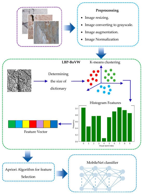 The proposed model contains multiple steps: preprocessing, feature extraction based on LBP–BoVW, feature selection and dimensionality reduction based on the Apriori algorithm, and classification using MobileNetV3_Large algorithms. Figure 1 explains the general structure of the proposed model.