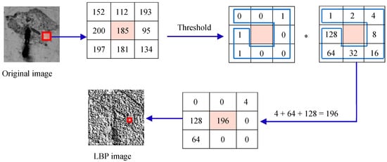 The LBP is a textural descriptor described by Ojala et al. [] and utilized for classification. To calculate a binary pattern, LBP compares the intensity of a center pixel (threshold) with the intensity of the 8 neighbor pixels around it. Figure 2 shows how the LBP works. LBP may be formalized as follows for a center pixel Ic and an adjacent pixel Ii (i = 1, 2, …, p) []: