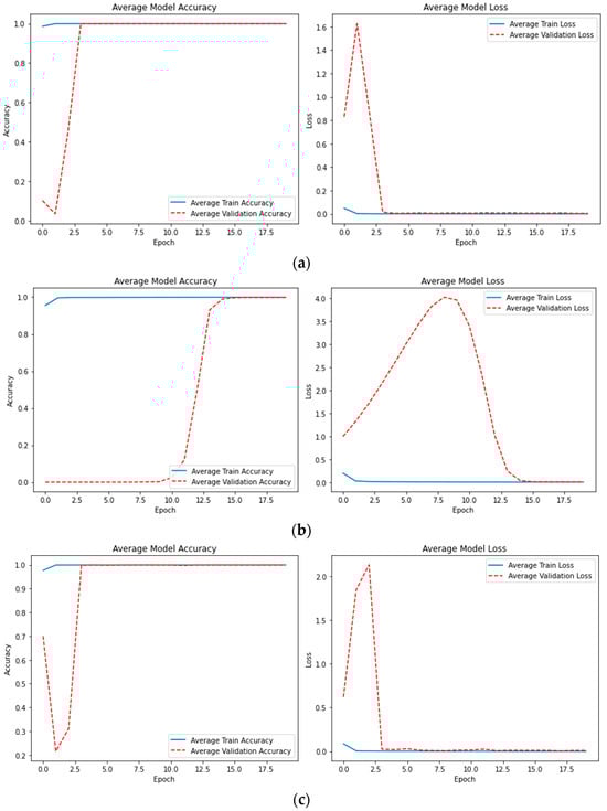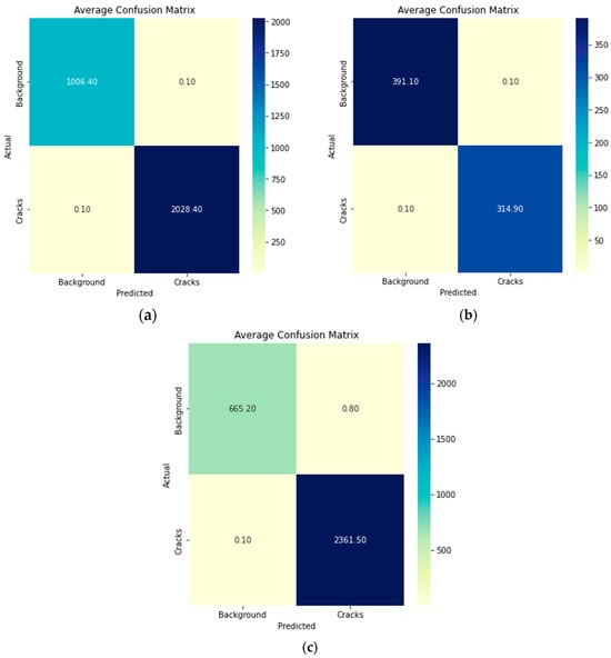As shown in Table 2, the BCD dataset with feature sizes of 100 performed the best, with an accuracy of 99.99% and a high recall of 99.99%, with a precision and F1 score of 100%, ROC–AUC of 99.99% and a 0.01 error rate. The best performance was attained by the Bridge dataset with a feature size of 300, with 99.97% for all performance metrics and an error rate of 0.03. The DIMEC-Crack dataset with feature sizes of 100 performed the best, with a high precision reaching 100%, which means there were no false positives, and 99.99% for all performance metrics, with an error rate reaching 0.01%. Figure 3 shows the plot of the average of the best accuracy and loss. Figure 4 shows the confusion matrix of the best results for each dataset.