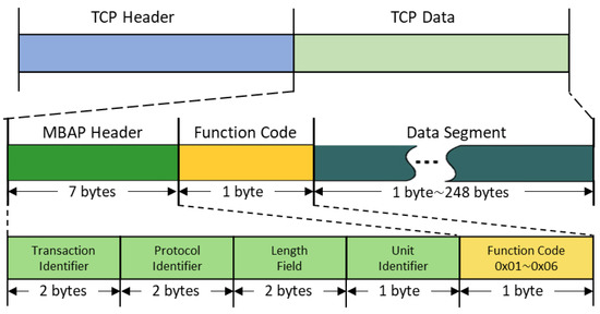 The Modbus TCP/IP protocol establishes standards for client/server communication between devices on Ethernet TCP/IP networks or other bus systems [15]. The protocol employs a simple application data unit (ADU) format to ensure compatibility among various devices, regardless of the devices in use. The entire Modbus packet is embedded within the data section of the TCP packet and transmitted over the network, as shown in Figure 1. Modbus TCP/IP uses two types of ADUs: request and response frames, both containing the Modbus application protocol (MBAP) header, function code, and data segment. Figure 1 displays the ADU format and standard function codes, with detailed descriptions of ADU fields available in the document [23].