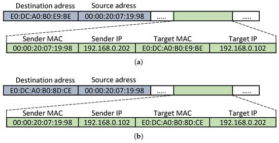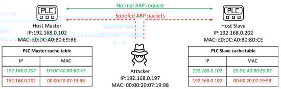ARP is designed to work efficiently under normal conditions but is not equipped to handle malicious hosts. Typically, when a master PLC needs to communicate with a slave PLC on the same network but does not know the slave’s MAC address, it sends an ARP broadcast request to all devices on the network. The slave PLC then responds with a unicast ARP reply containing its MAC address. Each device maintains a cache table that stores IP and MAC pairs from previous interactions. However, the ARP protocol has security limitations; one is its susceptibility to ARP spoofing, a common and easily executed attack. ARP spoofing-based man-in-the-middle attacks (MITM) exploit this weakness by allowing an unauthorized third party to intercept communication between two hosts on the same network secretly. The ARP protocol requires operating systems to maintain a cache table of ARP replies to minimize ARP broadcast requests. When a host receives any ARP packet, it automatically updates its ARP cache with the new <IP, MAC> association, even if the IP address is already in the table [25,28].