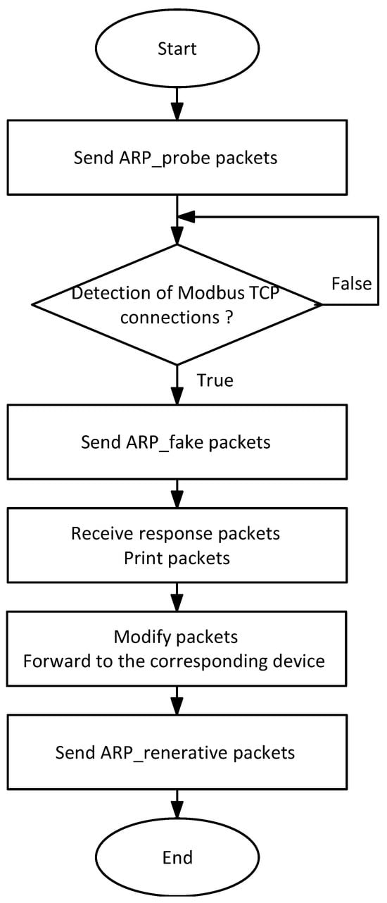 The program designed to interfere with the Modbus TCP/IP communication system follows these execution steps, as illustrated in Figure 6.