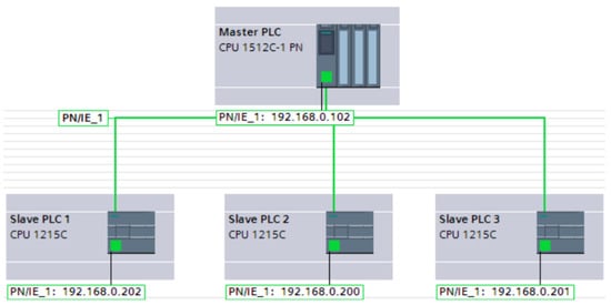 In this research, a typical industrial control system environment, as shown in Figure 8, is established using Siemens S7 series PLCs (Siemens, Munich, Germany) to evaluate the effectiveness of the proposed security toolkit. A Siemens S7-1500 CPU 1512C-1PN is configured as the master PLC—representing a device located in the control room—which transmits control commands to, and receives status updates from, slave PLCs in the field. The system includes three Siemens S7-1200 CPU 1215C units acting as slave PLCs, responsible for data acquisition and response transmission. Communication between the PLCs is facilitated via the Modbus TCP/IP protocol, which serves as the basis for validating the proposed attack and detection mechanisms. This experimental setup enables controlled injection and monitoring of malicious traffic and supports the assessment of data integrity throughout the communication process.