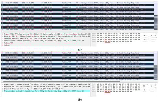 (a) Master PLC sent Query Write to the attack toolkit (b). The attack toolkit sent Query Write to the slave PLC. The red box indicates the data of Register 1 in the Query Write packet.