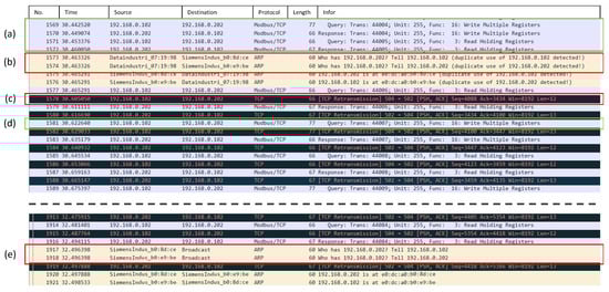The entire testing process: (a) Modbus TCP packet exchanged between PLCs before the attack, (b) ARP_fake sent to both PLCs, (c) Query packet intercepted by the attack toolkit, (d) Modbus TCP packets forwarded to another PLC, and (e) ARP_regenerative sent to restore communication.