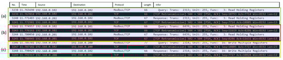 After modifying the packet’s data, the attack toolkit sends the ARP_regenerative packets to the PLCs as shown in Figure 11. Figure 12 shows the packets exchanged between two PLCs before and after the attack on the system, demonstrating that the system continues to operate normally after the attack. As shown in Table 1, the total time from when the master sends a request to when the master receives a response during interference is within 6 ms, which is less than the master’s response timeout of 2 s. This value is configured by the RCV_TIMEOUT parameter in the MB_CLIENT block, with a range of 0.5–55 s, and a default value of 2 s. Therefore, such a packet latency still ensures normal operation for the initial system.
