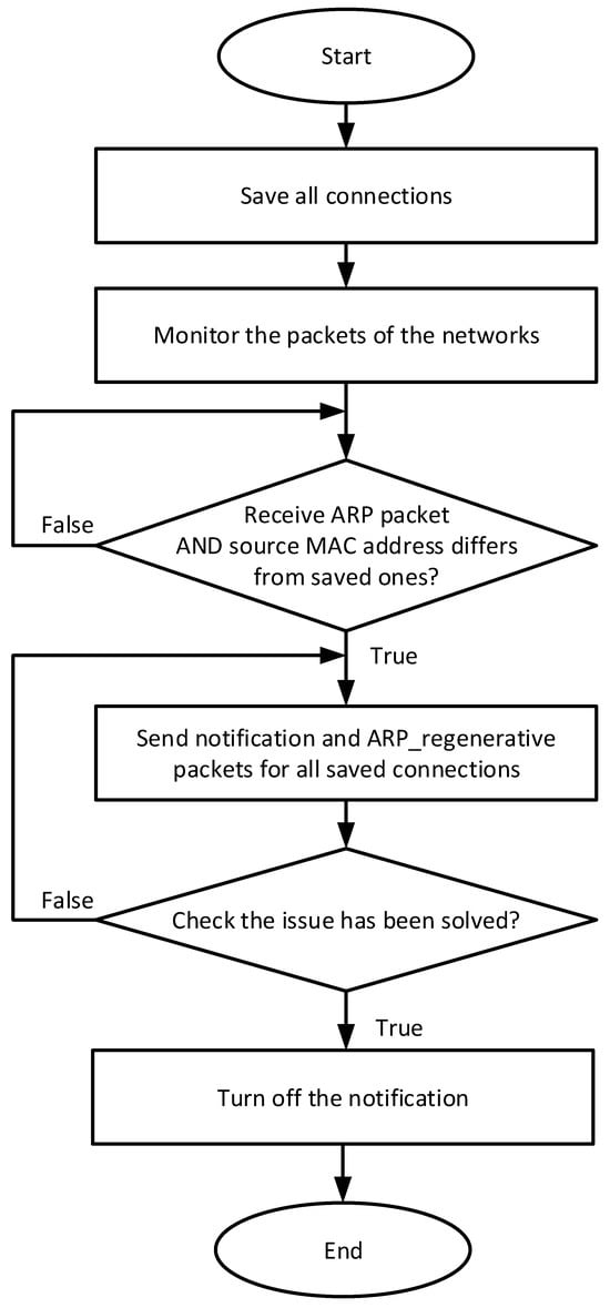 In this section, we present a security solution to protect against ARP spoofing attacks. The same toolkit is used to monitor and counter ARP spoofing attacks in the network. The operation of the protective device is outlined in the flowchart in Figure 15 and can be implemented through the following steps.