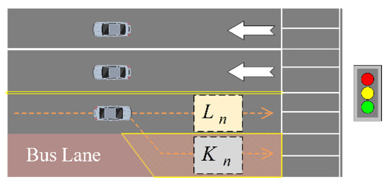 We define as the termination time of the nth time slot. Here, denotes the number of private vehicles in the regular lane, while represents the count of private vehicles in the IoT-SBL. Additionally, indicates the number of time intervals that have elapsed since the start of the most recent green light phase at the signal intersection, beginning from time n. The overall signaling state throughout the complete cycle can be represented as . Given that private vehicles can only enter the IoT-SBL or exit the signal intersection stop line at the boundaries of the time intervals, the system state can be characterized by .