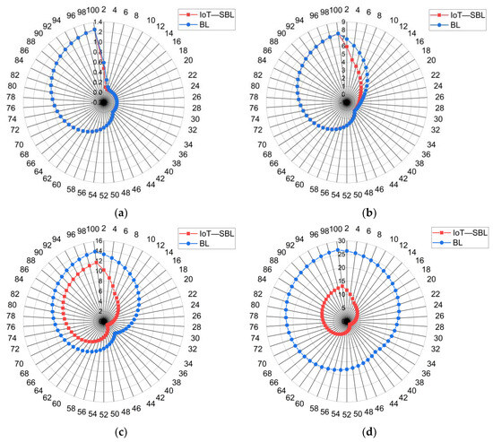 The outer circles denote the signal cycle duration (seconds) while the inner circles show average queue lengths (pcus). At , peaks at 28 vehicles (traditional lane) vs. 15 vehicles (IoT-SBL), while reaches 12 vehicles. With each increase in saturation, it is evident that the IoT-SBL strategy significantly reduces queue lengths compared to the bus lane strategy. This analysis highlights the potential of IoT-SBL in optimizing traffic flow and enhancing overall intersection performance, particularly in high-saturation scenarios, ultimately contributing to a more efficient transportation system.