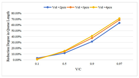 The impact of the IoT-SBL strategy on reducing vehicle queue lengths across various saturation levels is depicted in Figure 5. At a saturation level of 0.1, the IoT-SBL strategy achieves a queue length reduction of up to 2.91%. Conversely, at a saturation level of 0.97, this reduction can reach an impressive 71.15%. The findings presented in Figure 4 and Figure 5 align with expectations, as the traditional bus lane strategy effectively manages traffic under low saturation conditions, rendering the IoT-SBL strategy less critical. However, as saturation levels increase, the traditional bus lane strategy becomes progressively less effective in handling high traffic volumes, underscoring the advantages of the IoT-SBL strategy in these scenarios. Additionally, it is important to note that the performance of the IoT-SBL strategy is contingent upon its capacity, which is primarily influenced by the prevailing traffic volume.