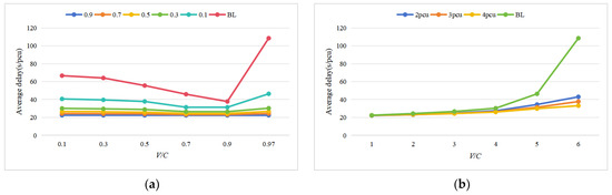 Figure 6a presents a comparison of different IoT-SBL strategies against the bus lane strategy at varying saturation levels and capacities. At saturation levels below 0.5, both strategies demonstrate similar vehicle delays, as the signal intersection operates without congestion due to low saturation. However, as saturation levels exceed 0.5, particularly reaching 0.97, the advantages of the IoT-SBL strategy become increasingly evident. During this higher saturation, the traditional bus lane strategy experiences a significant rise in vehicle delays, while the IoT-SBL strategy manages to maintain delays within an acceptable range.