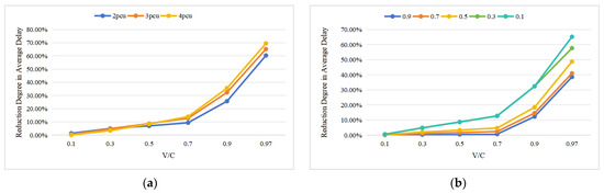 Reduction degree in average delay: (a) Different IoT-SBL volumes; (b) Different bus departure frequencies.