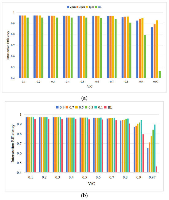 Intersection efficiency is another key indicator for evaluating the performance of the signal intersection, primarily reflecting the capacity for emitting vehicles during the green light cycle. Like the analysis of delays, it assesses throughput efficiency at various saturation levels under two different strategies