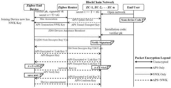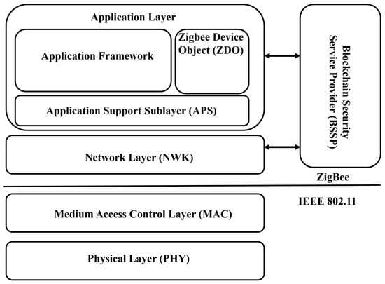 Blockchain—The Trust Security Service Provider: The proposed blockchain system, called Blockchain: The Trust Security Service Provider (B-TSSP), provides an open trust model that allows end-to-end security among IoT-enabled Zigbee devices by reusing the same cryptographic credentials among the Zigbee IP protocol stack on the same Zigbee edge device. In other words, this proposed BCS provides the trust security service to the Zigbee IP protocol stack. By providing many security services, the B-TSSP makes the security procedures possible. These include creating an end-to-end application key, leaving a secured network, joining a secured network, distributing network-wide keys, updating network keys, managing network access and authenticating routers and end Zigbee devices, keeping frames safe, storing key credentials, and restoring important security and network configuration data. It also has security mechanisms for the Network APS Security sublayer. Figure 3 shows the proposed Zigbee IP protocol stack security with an attack landscape.