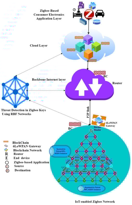 A hybrid security architecture using RBF networks and blockchain can improve Zigbee-enabled IoT network security. RBF networks ensure data integrity, authentication, and confidentiality for proactive threat identification, whereas blockchains ensure safe, decentralized key distribution. Intelligent Threat Pre-Identification Using RBF Networks: We discover security issues using RBF-based machine learning. These models analyze network traffic and device behavior in real time to identify security concerns such as unauthorized access, data manipulation, and denial-of-service attacks. Early threat detection and mitigation improve network security with this proactive solution. Blockchain technology allows decentralized, immutable key management. The proposed Blockchain-based Trust Security Service Provider (B-TSSP) protects Zigbee edge device cryptographic credentials. Zigbee routers, end devices, and coordinators securely use blockchain ledgers for digital key credentials and authentication. The proposed framework utilizes a blockchain-based trust management mechanism to enhance the dependability of Zigbee-enabled IoT connectivity []. These tracts authenticate device identities, implement trust protocols, and record security transactions. The lightweight blockchain architecture ensures secure, undisputed network connections for Zigbee-enabled IoT devices with minimal computing power and energy consumption. This simplified architecture lowers computing costs and ensures security. Latency and energy use via efficient cryptographic methods and consensus processes make the solution scalable for resource-limited IoT applications. For secure communication, Zigbee devices employ end-to-end encryption. Communication is protected by mutual authentication and key agreements. The protocol includes a PUF to secure devices. The Zigbee IP protocol stack allows multi-layer security in the proposed scheme. These layers consist of physical, MAC, adaptation, network, and routing components. Bee-enabled IoT devices’ routing and communication are secure using IEEE 802.15.4 [,].