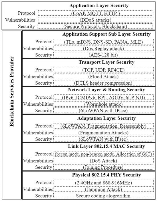 The proposed Zigbee IP protocol stack security architecture, is made up of “Zigbee IP alliance security” and “applications security”. The link layer (MAC) and PHY (802.15.4) security are supported by the IEEE 802.15.4 standard. The Zigbee IP alliance offers network adaptation layer security, network layer security, routing layer security, transport layer security, application support sublayer security, application layer security, and blockchain service providers.