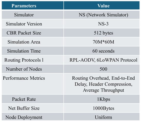 - Priyeash, B.; Thyagarajan, J. Performance evaluation and comparison analysis of AODV and RPL using NetSim in low power, lossy networks. In International Conference on Futuristic Communication and Network Technologies; Springer Nature: Singapore, 2020; pp. 11–22. [Google Scholar]