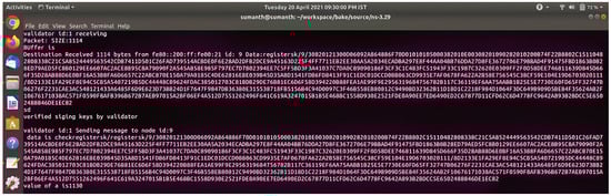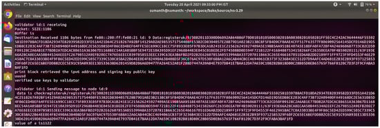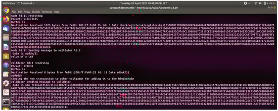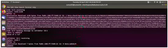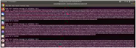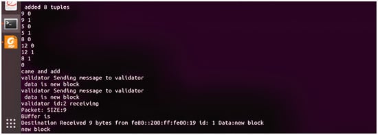 Figure 11 shows the registration confirmation message between the validator and Zigbee node after both sides verify the process. Consider the possibility that the validator chooses not to add the block to the blockchain. The validator will then forward the registration request to the suitable validator (selected randomly using a round-robin approach) so that they may add the block to the BCS. Figure 11 shows the communication message between the group of validators for the creation of the blockchain.