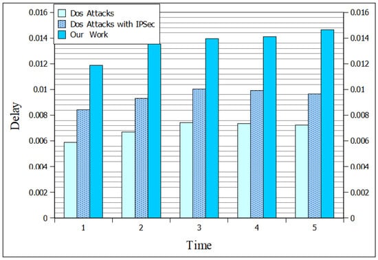 The request and response time between the Zigbee creation and adding the block to pBCT network takes 57.44 ms. The key generation from the pBCT network takes the average response time as depicted in Figure 17. The request and response time for adding a block to the PBFT network from Zigbee creation is measured at 57.44 ms. Key generation from the PBFT network exhibits an average response time, with a maximum of 12.46 ms for key pair generation. Additionally, signature creation and verification times for Zigbee coordinators are 32.45 ms and 30.3 ms, respectively, indicating the computational efficiency of the proposed system, see Figure 18. For generating the key pair, the maximum response time is 12.46 ms. The creation of the signature takes 28.18 ms and the verification of the signature takes 26.9 ms by the Zigbee coordinators. For the Zigbee coordinators, the creation of the signature takes 32.45 ms and the verification of the signature takes 30.3 ms. The edge device needs to be validated properly by the Zigbee coordinators. An average end-to-end delay of the routing protocols is depicted in Figure 19. The average throughput of the AODV, RPL, and RPL-AODV protocols is depicted in Figure 20.