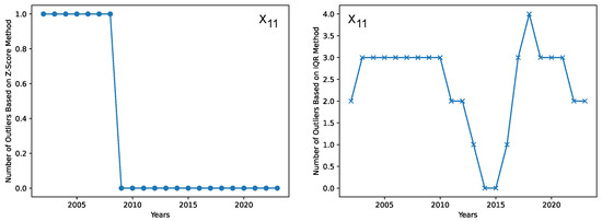 We log the number of outliers and produce plots for each predictor detected by both outlier detection methods. The maximum number of outliers is 1 in each year of data (among the 30 regions) based on the z-score method, while the number of outliers ranges between 0 and 5 based on the IQR method. Because we choose to use 12 predictors for each subsystem, there are a total of 48 plots for our dataset O. Readers who are interested in viewing these plots may generate these plots via an our source code. Here we only show in Figure 2 two plots for the predictor , one on the number of outliers based on the z-score method, and the other based on the IQR method.