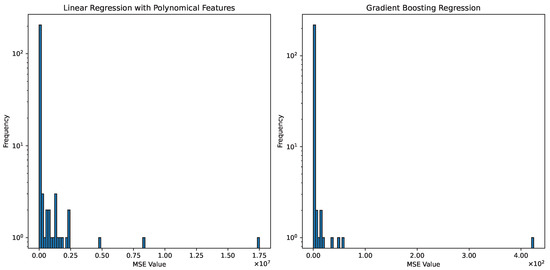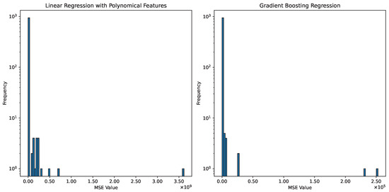 Considering that there are numerous regression models that we can choose from, we need to decide one that would produce the best estimated missing data. Because we are filling missing data, there is no direct way of determining the accuracy of the estimated missing data via regression. The best that we can do is to make the following hypothesis: if the mean squared error (MSE) of the regression on the available data for the region is smallest, then the estimated missing data would have the best accuracy. To be practical, we experiment with two regression models: (1) linear regression with polynomial features (LRPF), and (2) gradient boosting regression (GBR). For LRPF, we use three-fold cross-validation to tune the polynomial degree as the only tunable parameter. For GBR, we choose to use the default parameters. The training MSE is collected for both LRPF and GBR for whenever a missing data item is present. The histograms (with 100 bins) of MSE for LRPF and GBR are shown in Figure 3. As can be seen, although the shapes of the histograms are quite similar, with the great majority of MSE close to the smallest bins, the MSE for GBR is smaller than that for LRPF. Hence, it is obvious that we should use GBR to generate missing data. Nevertheless, the presence of a few occurrences at very large MSE bins indicate that some of the generated data could be of low quality. How to further enhance the quality of the generated data is left for future research because the fraction of potentially bad data is very small (which would have a negligible negative impact on the results).