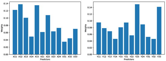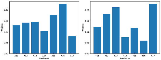 The objective-weighting Python library (https://pypi.org/project/objective-weighting/) (accessed on 1 March 2025) is used as the basis for the calculation of the weights of the predictors. The reason why we cannot use that library as it is is because the entropy weighting function uses a sum normalization instead of the min-max normalization. The purpose of sum normalization is to scale the values in a vector so that the sum of the scaled values equals to 1. On the other hand, the min-max normalization would scale all values to a range between 0 and 1. Hence, for our study, the min-max normalization is used. The source code of the entropy weighting function in the objective-weighting python library is modified accordingly. The weights calculated this way are shown in Figure 5 for our dataset, and shown in Figure 6 for the reference dataset.