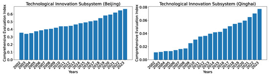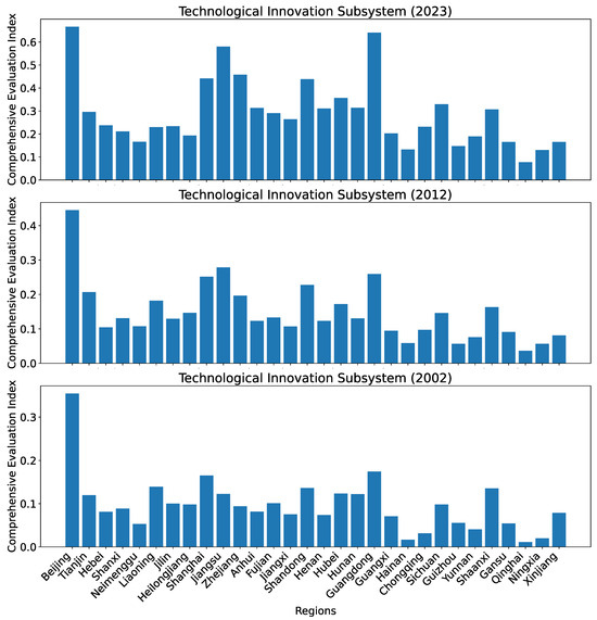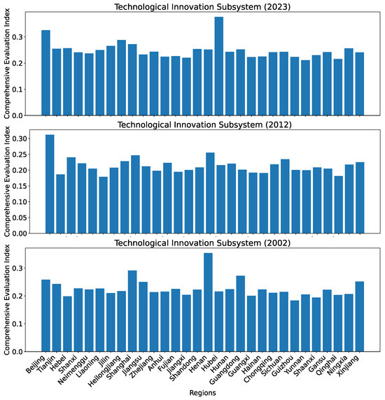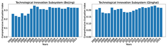 In this section, we report the comprehensive evaluation index for the technological innovation subsystem. The complete calculated indices for all 30 regions in years 2002–2023 for dataset O is provided in Appendix B, Table A3. The complete indices for the reference dataset R are provided in Appendix B, Table A5.