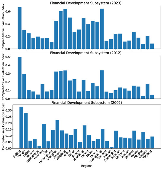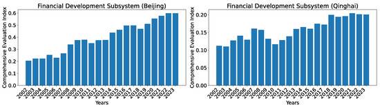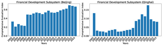 For the technological innovation subsystem in the dataset R, the largest weight is 0.227 (for ), and the smallest weight is 0.079 (for ). For the financial development subsystem in the dataset R, the largest weight is 0.229 (for ), and the smallest weight is 0.059 (for ).