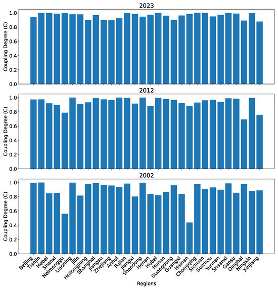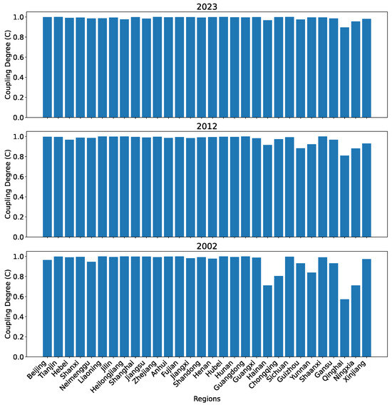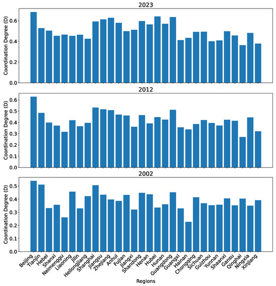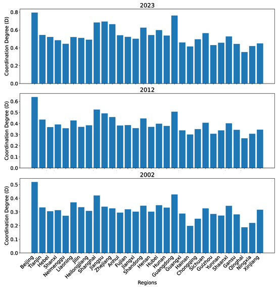 First, we provide an overview of the indices for all 30 regions in 2002, 2012, and 2023, for the technological innovation subsystem calculated using dataset O in Figure 7.