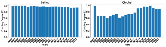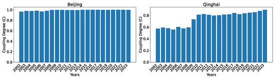 where T is the combined evaluation index for and , and it is defined as , and . If system 1 and system 2 are of equal importance, which is the case of our current study, . As can be seen, unlike C, only when both and are 1 would D be 1. If both and are at a low level of development, D would be close to 0 as well.