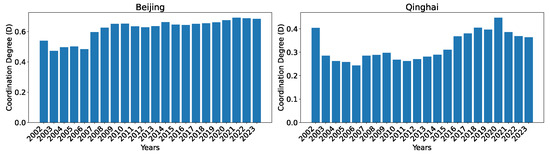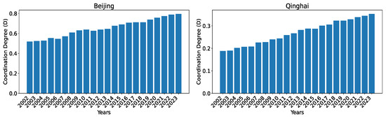The coordination degree focuses on the subtle relationship between the two subsystems in that the two subsystems should not only be synchronized in their development but also have a symbiotic relationship that makes each other better. D is defined in [30] by Equation (8):