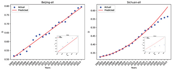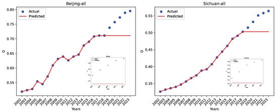 As can be seen in Figure 9, the development levels across different regions appear rather similar when we use the set of seven predictors proposed in [3]. What is also odd is that Henan has the highest index value in 2002, and Hubei has the highest index value in 2023. The calculated distribution of the indices clearly fail to match the reality in China. Beijing, the capital city of China, has a concentration of the best higher educational institutions in China. As such, Beijing should be expected to have the highest technological innovation index. Henan and Hubei are nowhere near the level of Beijing. This demonstrates that the choice of the set of predictors is very important to deriving the development levels of each subsystem. The issue of using the set of seven predictors is further evident from the evolution of the indices over time as shown in Figure 10. Unlike the gradual but consistent increase in the development levels for Beijing and Qinghai from 2002 to 2023 shown in Figure 8, what is shown in Figure 10 implies that the development levels for Beijing and Qinghai in recent years (2007–2023) are basically stagnant, which clearly fail to reflect the reality because we all know the rapid technological development in China during that period.