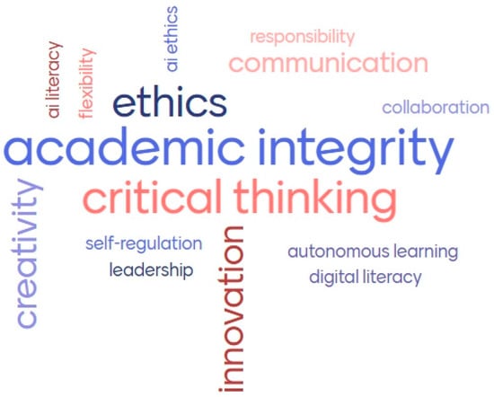 The study on generative artificial intelligence in higher education underscores the significance of transversal competencies—skills that are essential across diverse academic and professional settings. These encompass critical thinking, communication, teamwork, leadership, ethics, and creativity, along with more specialized areas such as digital literacy and AI ethics. Particularly noteworthy are competencies like academic integrity, innovation, and communication, which highlight the importance of a responsible, ethical, and reflective approach to the integration of AI in educational contexts (see Figure 2).