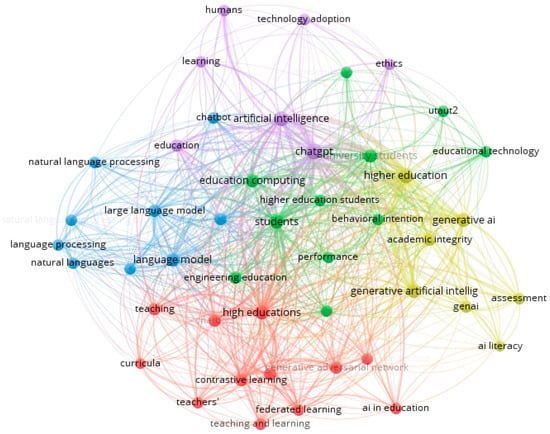 The yellow cluster mainly addresses the ethical and educational competencies needed for the proper use of generative artificial intelligence, with emphasis on digital literacy and academic integrity; the purple cluster represents connections related to ethics and learning processes linked to the adoption and use of technologies such as ChatGPT, the green cluster focuses on the use of educational technologies and educational computing in higher education and how these influence behavioral intentions and student experience, the blue cluster with main concepts such as: “Large language model”, ‘language processing’, ‘education computing’, focuses on the technical aspects of language models, while the red cluster with concepts such as: ‘Teaching’, ‘curricula’, ‘contrastive learning’, ‘federated learning’ connotes innovative pedagogical methodologies, curriculum design and collaborative learning approaches mediated by generative artificial intelligence. Each cluster reflects a key theme within the conceptual framework of generative artificial intelligence in higher education, showing the interactions between the concepts and their relevance in the development of this field.