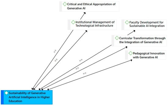 The analysis of clusters and their connections contributes to creating a holistic conceptual framework on generative artificial intelligence in higher education, integrating several key perspectives and dimensions that interact synergistically. Subsequently, a thematic analysis was performed in ATLAS.TI version 8, which allowed for a categorization process by grouping the codes into new emerging categories that constitute key processes for the sustainability of generative artificial intelligence in the development of transversal competencies in higher education (see Figure 4).
