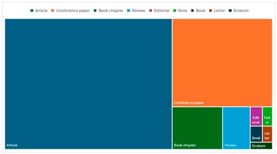 The distribution of scientific production on generative artificial intelligence in higher education shows a clear predominance of academic articles, followed by papers presented at conferences. This suggests that research in this field is mainly disseminated through peer-reviewed publications and specialized congresses, reflecting the relevance of the topic in the academic community. To a lesser extent, book chapters and reviews are found, indicating that there is also an effort to consolidate knowledge in more structured formats. Other types of documents, such as editorials, notes, books, letters, and errata, have little presence (see Figure 5).
