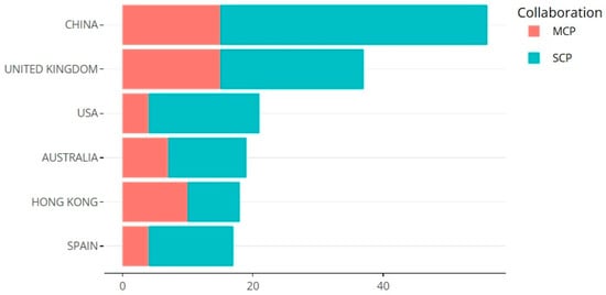 The above is complemented by a graph that visually shows the proportion of publications from each country; the blue part of the bar represents publications by authors from a single country (SCP), while the red part represents publications in international collaboration (MCP). See Figure 6.