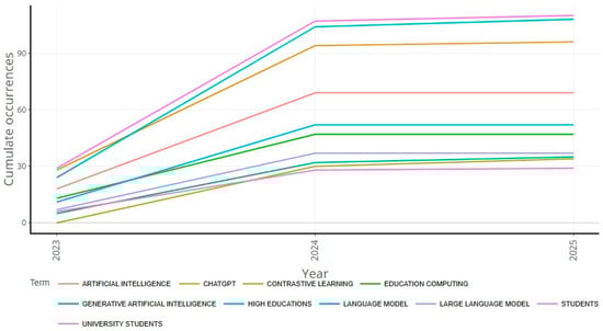 The figure shows how the academic community massively turned its attention in 2023–2024 to ChatGPT, large language models, and generative AI, which is reflected in a very pronounced spike in these keywords. From 2024 onwards, the growth slows down, indicating that the topic enters a consolidation stage. Meanwhile, more classical concepts of AI and contrastive learning, as well as learner research, continue to grow, but more gradually (see Figure 9).