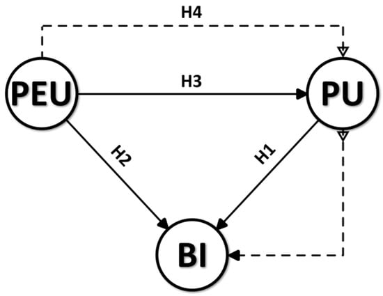 The authors of [] conducted a meta-analysis synthesising cross-domain TAM data from 26 empirical studies. Their results revealed that PU was the strongest predictor of users’ BI, with path coefficients ranging from 0.09 to 0.91 and a mean of β = 0.49. The findings also indicate that compared to the modest direct influence of PEU on BI (range β = 0.07–0.59; mean β = 0.27), its effect on PU was more substantial, with coefficients ranging from 0.42 to 0.54 and a mean β of 0.48.