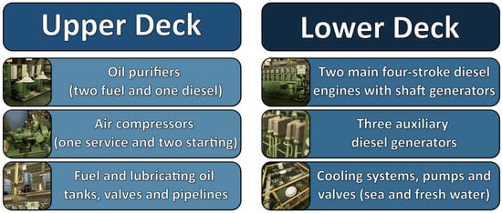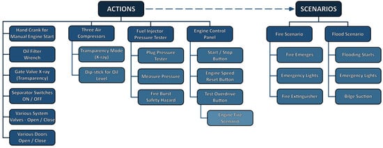 The lower deck houses two main four-stroke diesel engines, each connected to a shaft generator and propeller shaft, with three auxiliary diesel generators, a range of cooling systems, valve networks, pipelines, pumps, and other essential engine room apparatus. The upper deck includes two starting air compressors, a service air compressor, two Heavy Fuel Oil (HFO) purifiers, a diesel oil purifier, and associated systems such as lubricating and fuel oil pipelines, tanks, and control valves (Figure 2). The simulator was developed for compatibility with the Windows-based operating system and designed to support both wired and wireless VR headset connectivity, allowing interoperability with various HMD platforms. Key functional features, including actions and scenarios, are depicted in Figure 3.