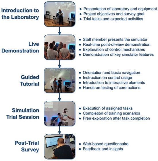 Upon completion of the trial exercises, students were requested to complete a post-use questionnaire design to evaluate their experiences with the HMD-VR engine room simulator. The data were collected through a computer-based, self-administered instrument implemented via the Lime Survey (6.3.5) software. On average, participants required approximately 10 min to complete the questionnaire. Notably, there was full compliance among the sample, with all 84 completed questionnaires deemed valid for subsequent analysis. The full procedural workflow is presented in Figure 4.