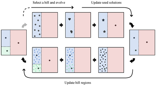 An intuitive flow of the above processes can be illustrated in Figure 2. First, a hill region is selected and the population is initialized inside the hill region. Different hill regions are denoted by rectangles of different colors. Individuals in the population are denoted by solid gray circles. Once the population is stagnant, candidate solutions, which are denoted by pentagrams, are selected from the population. Seed solutions, which are denoted by solid colorful circles, are updated according to the candidate solutions. After that, in any hill region that contains more than one seed solution, such as the blue hill region in our example, random solutions will be sampled, which are denoted by black points, and then grouped. Solutions belonging to the group of each seed solution are denoted by the points of the same color as the seed solution. After clustering, the hill region is divided into multiple hill regions, any of which contains only one group of solutions.