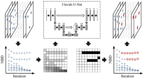 To automatically identify these outliers, the variation in the distribution of NBDs is transformed into an image according to Equations (4) and (5). denotes the specified resolution of NBD, which is set to 50 in this paper, and denotes the value of pixel in the r-th row and t-th column. Input the image through a 3-level U-Net model [26], an output image highlighting the pixels corresponding to the outliers is generated, where denotes the value of pixel in the r-th row and t-th column. According to the image, the candidate solutions in each generation can be obtained, where the threshold value is set to . For the ease of use, the candidate solutions in the last generation is selected. To prevent the loss of potential seed solutions during the evolution, candidate solutions from other generations can also be selected.