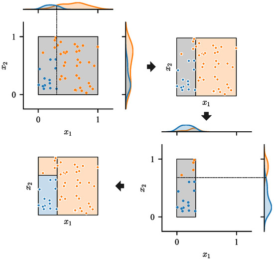 The method for dividing a hill region by the groups of solutions in heuristic mode is shown in Algorithm 7. It consists of two parts. In the first part, the subspaces composing the hill region are continuously bisected until each of the subspaces only contains individuals from the same group. For continuous search spaces, which are concerned by this paper, a subspace is bisected along the axes. Regarding the specific dimension to be selected and the specific position to split in this dimension, an intuitive illustration is shown in Figure 4.